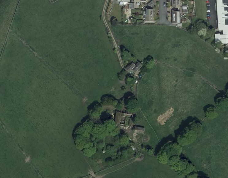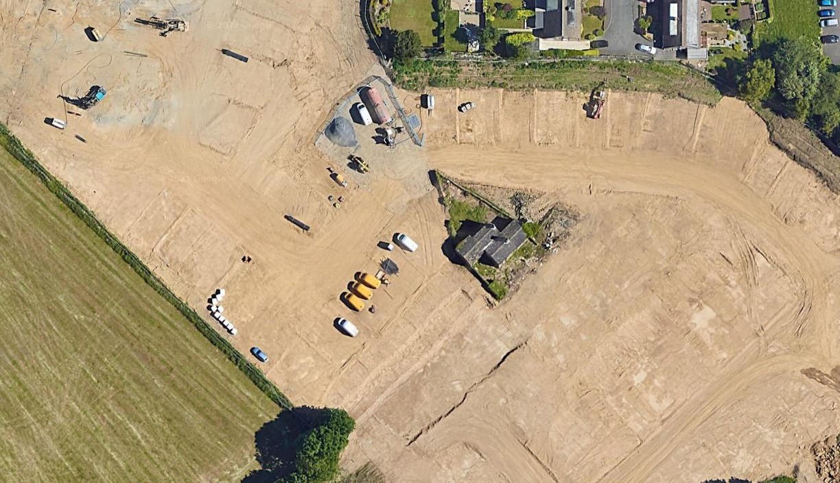 A farmhouse remains as an island in the midst of ground preparation for the arrival of 267 houses. The open countryside that has been sacrificed (along with a number of farm buildings already) can be seen to the aerial image on the right.