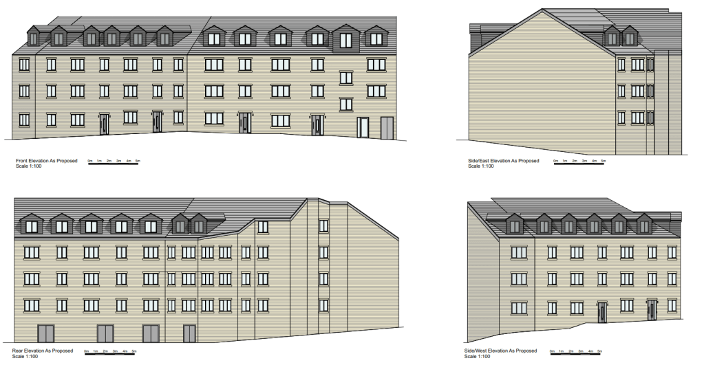 The attractive stone pub above will be lost to clear a site for 11 dwellings, the elevations for which can be seen below