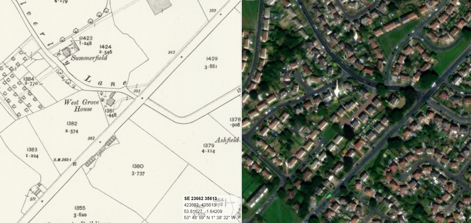 Looking at this historic maps of Bramley, this would appear to be West Grove House, which somehow survived the suburbanisation en-mass of Bramley. As such the house now sits within a matrix of semi-detached red brick former counsil housing behind high hedges and an estate wall.